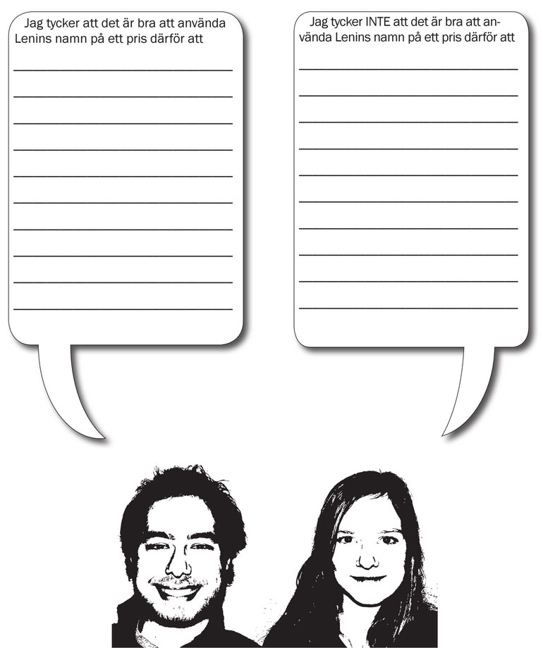 Uppgift: Till höger (här nedanför!) ser du två personer som har olika uppfattningar om namnet på priset. Visa genom att fortsätta meningarna i pratbubblorna hur de kan motivera sina olika uppfattningar.