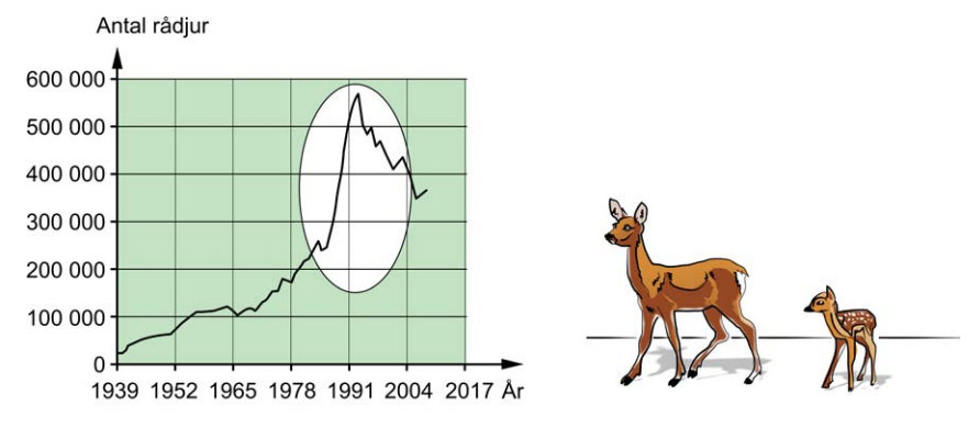 Populationsstorleken för rådjur varierar från år till år. Variationen kan bero på olika faktorer som till exempel konkurrens eller jakt. Ingen av de två nämnda faktorerna kan dock förklara den kraftiga uppgången och nedgången i rådjurspopulationen som diagrammet visar.