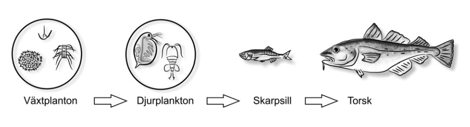 Utgå ifrån bilden av näringskedjan och förklara varför det blir algblomning när mängden torsk minskar.