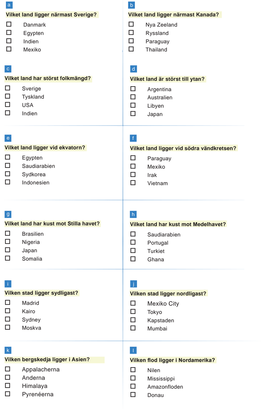 * När det gäller flervalsfrågor kan det variera hur många alternativ du ska kryssa för, läs därför instruktionerna noga.