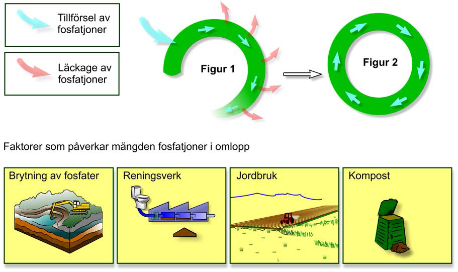 Figur 1 och Figur 2 beskriver tillförsel och läckage av fosfatjoner i omlopp.