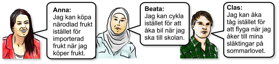 Annas, Beatas och Clas förslag bidrar olika mycket till att utsläppen av växthusgaser minskar och till en hållbar utveckling.