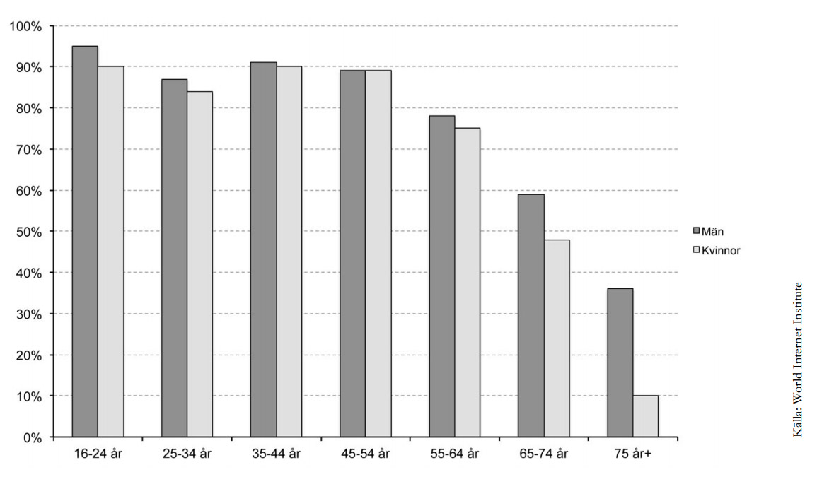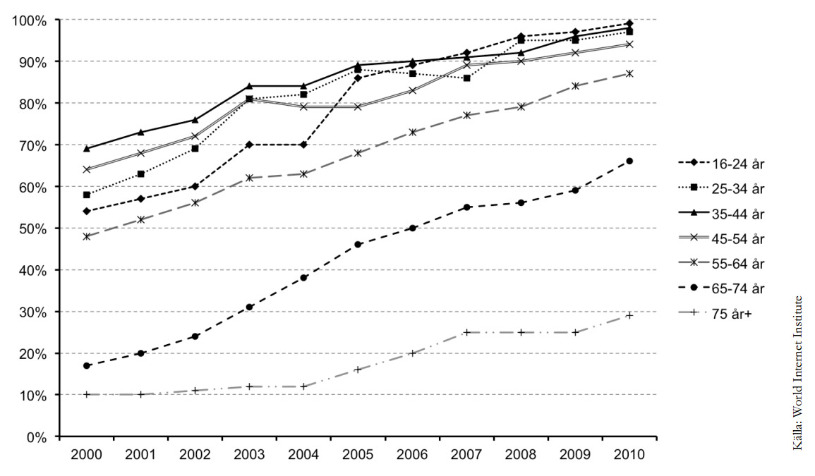 Ett urval av cirka 2 000 invånare i Sverige fick under åren 2000–2010 svara på frågor angående internet. Nedanstående diagram visar hur stor andel (%) i olika åldersgrupper som hade tillgång till internet i hemmet.