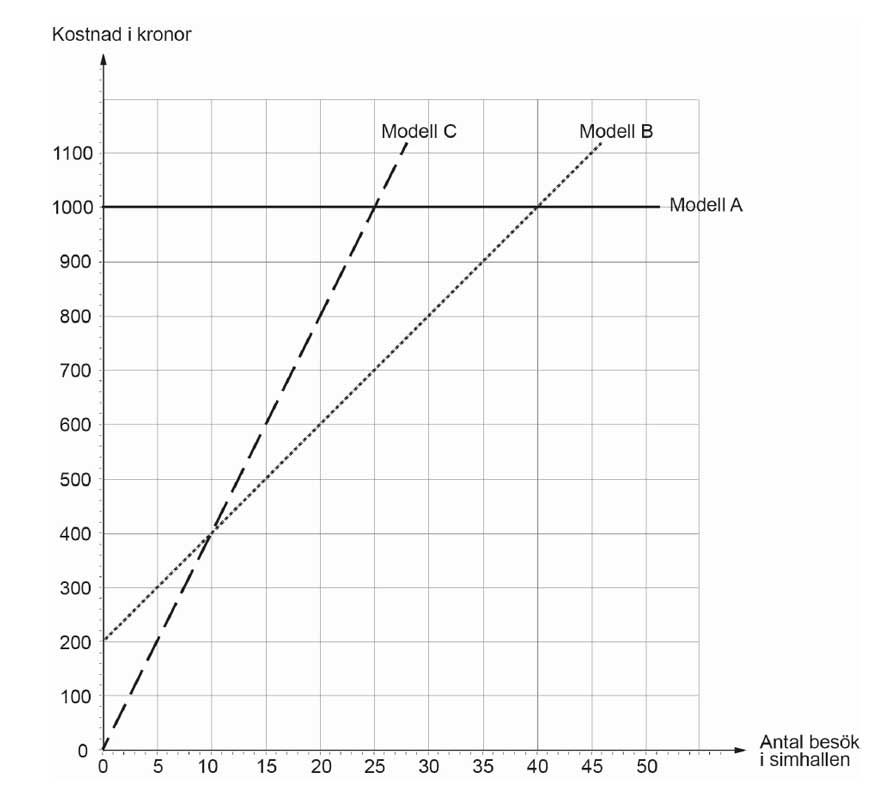 Du kan välja mellan tre olika betalningsmodeller A, B och C när du besöker simhallen under ett år. Diagrammet visar de tre betalningsmodellerna.